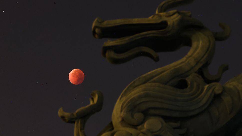 5- Yang Bo captures the sky over Nanjing, China during totality, creating the illusion that the blood moon is being grasped in the claw of a vast stone dragon.