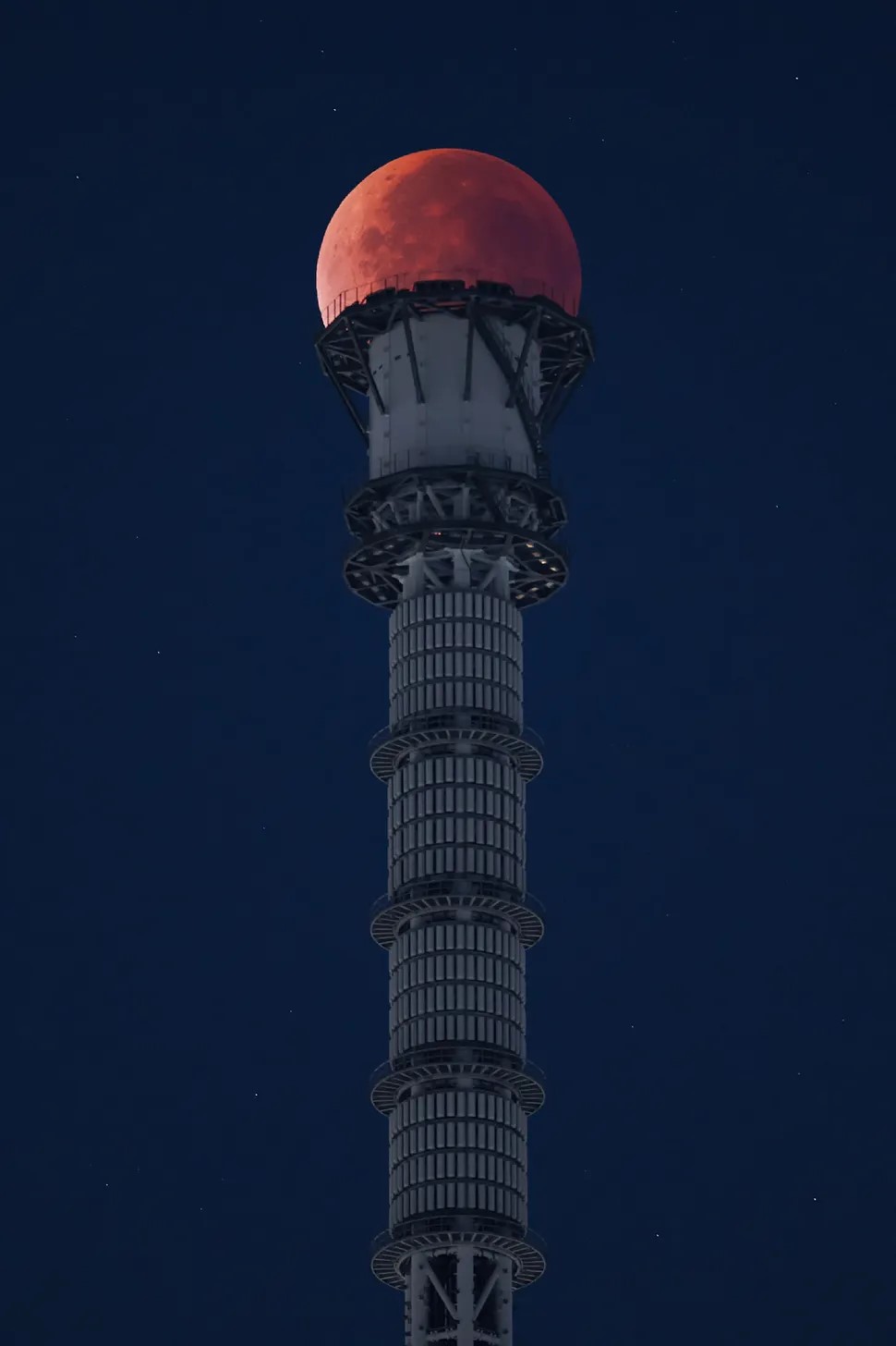 3- This composition positions the blood moon atop Tokyo's famous Skytree tower in Japan, giving the impression that the lunar disk is a red orb fixed to the top of a metal staff.